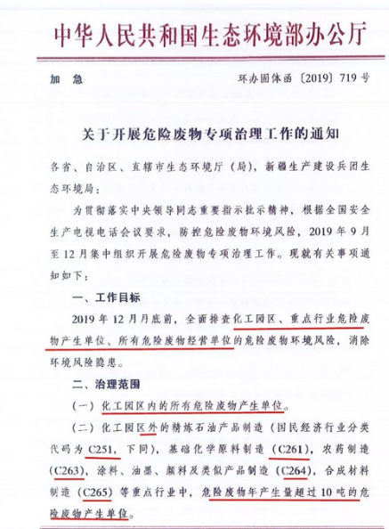日前生態(tài)環(huán)境部印發(fā)加急文件《關于開展危險廢物專項治理工作的通知》。 《通知》要求今年年底前,在全國范圍內(nèi)排查化工園區(qū)、重點行業(yè)危險廢物產(chǎn)生單位、所有危險廢物經(jīng)營單位的危險廢物環(huán)境風險,消除環(huán)境風險隱患。