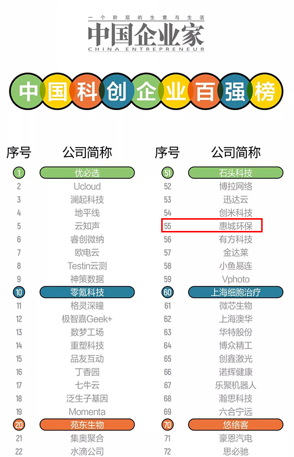 惠城環(huán)保榮登中國科創(chuàng)企業(yè)百強榜