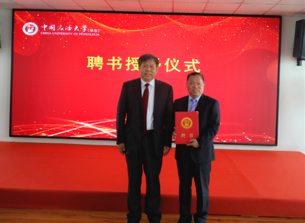 隨后,郝芳校長代表中國石油大學(華東)向我司董事長張新功頒發(fā)兼職教授聘任證書。